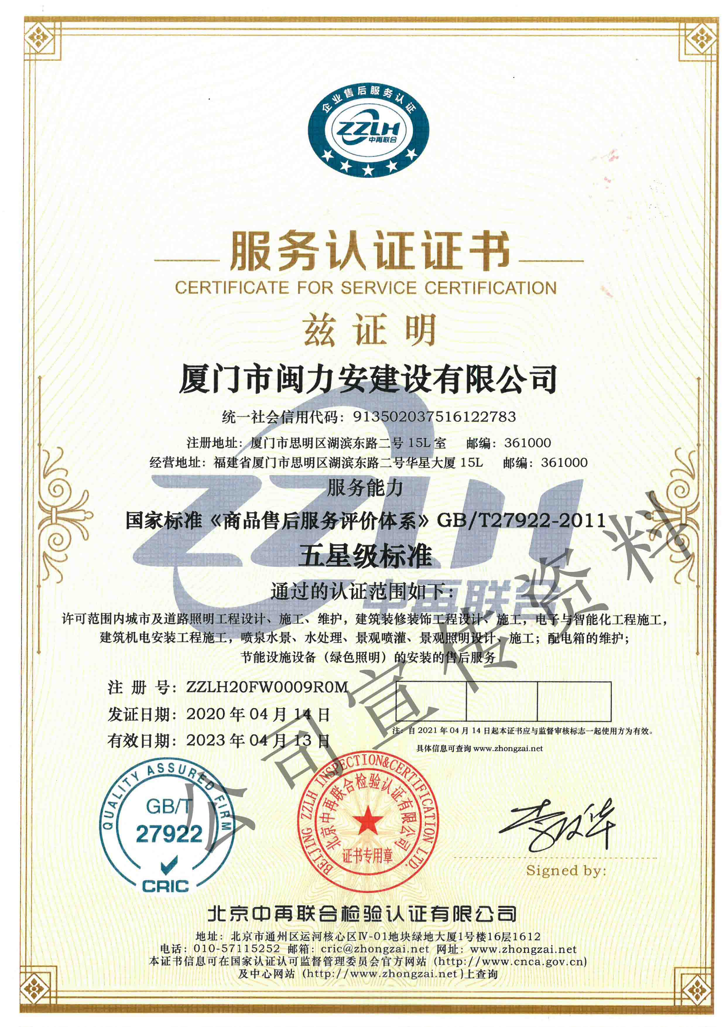 祝賀閩力安取得:售后服務認證證書